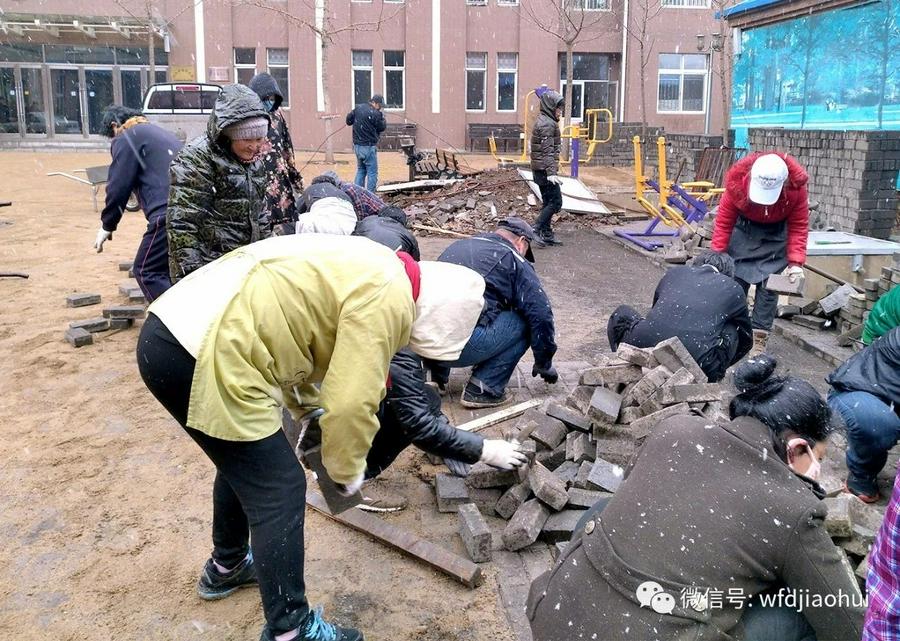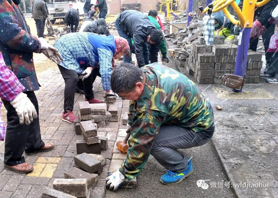 在三天的劳动中,劳动场面热火朝天,有推车运砖和沙石的,有搬砖的,有扬沙的,有铺砖的,有挖沟的。最感人的是4月6日上午突然下起雪来,很多弟兄姊妹顶风冒雪坚持参加劳动。