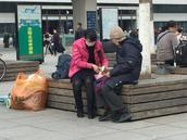 聊完后,老人跟我道了谢,继续走向其他人。她在广场上转了一会儿,然后慢慢地走向火车站出站口,接着又朝火车站进站口走去。期间,偶尔有人给她些零钱,也有人给点儿随身携带的零食。在向人要钱的同时,老奶奶也走向垃圾桶,捡了几个塑料瓶。