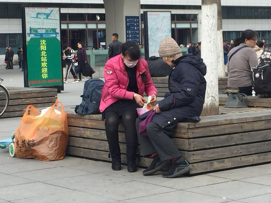这位老奶奶说:“我七十多岁了,有两个儿子,小儿子已经去世,儿媳妇明说我不能再跟她一起住;大儿子患有严重的心脏病,大儿媳常常对我说些难听的话,我受不了这个。”她说已经在沈阳北站流浪生活了两年,住在售票室二楼或者地铁通道里,大儿子知道这个情况,但也没有办法。老奶奶说她一个月仅有200多元的补助,低保没有办下来,要是有低保就好了。她还说,有一次摔伤了,是北站大客车一个工作人员带她去看病,花费了400多元,人家也没要钱。