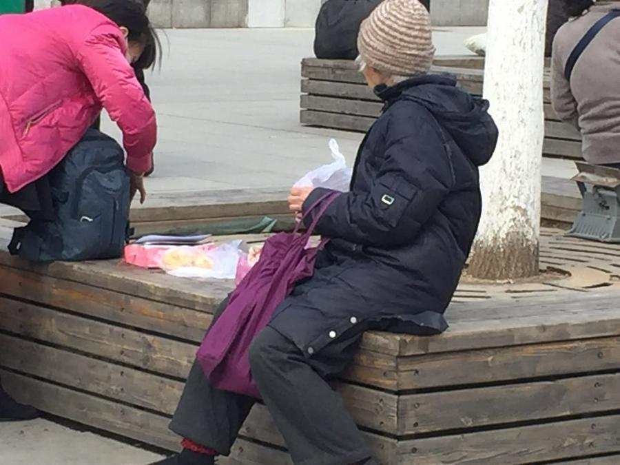 我向一个安保人员打听老奶奶的情况,对方说具体情况不了解,说像这位老奶奶这样在北站要钱的有好几位。我又跟一个打扫卫生的大叔聊了聊,大叔说,经常能看到这位老奶奶,他确定这位老奶奶不是骗子,而是被子女抛弃,无家可归。