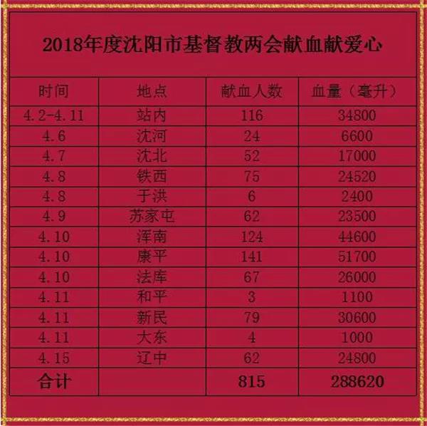 4月26日,沈阳市基督教两会微信平台公布了2018年献血活动的情况。今年的献血活动从复活节后的第二天(4月2日)开始,持续到4月15日。