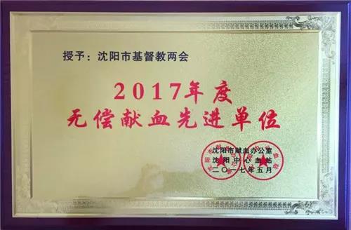 沈阳市基督教两会在2016年和2017年均被沈阳中心血站授予“无偿献血先进单位”。在沈阳市基督教两会2016年组织的无偿献血活动中,共有890人献血,献血量达305620毫升,还有一人捐献了血小板;2017年献血量有所下降,至少有643人参与献血,献血量达213770毫升。
