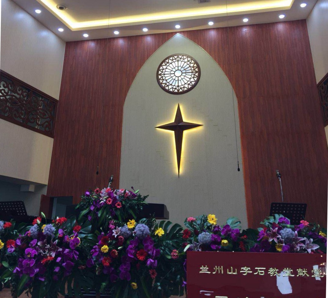 庆典这天,山字石教堂大门口布置着一个红色的充气拱门,上面写着“兰州市基督教山字石礼拜堂献堂庆典”;讲台前、讲桌上摆放着五颜六色的鲜花;讲台前还摆放着弟兄姐妹奉献的写着“愿这殿后来的荣耀,必大过先前的荣耀”、“耶和华以勒”的牌匾。
