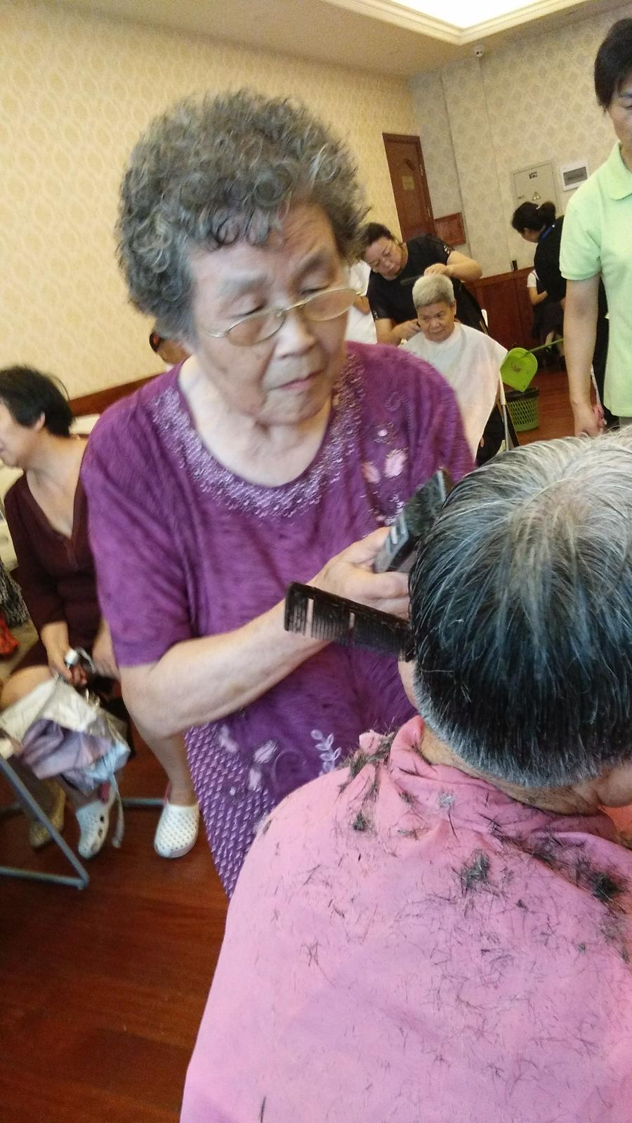 这八位弟兄姐妹,用自己娴熟的技术,面带着笑容,为前来需要理发的每位弟兄姐妹一一理发。招待组的几位姐妹认真地清扫地上的落发。