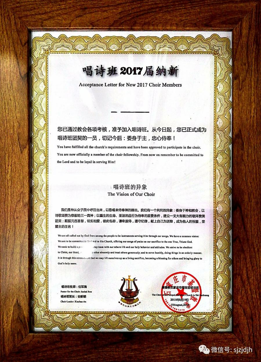 2018年8月19日下午,石家庄福音堂圣诗班在小教堂,为2017届第24期《圣乐理论基础班》通过各项考核和一年实习,各项成绩合格的八位同工举行了结业暨纳新典礼。