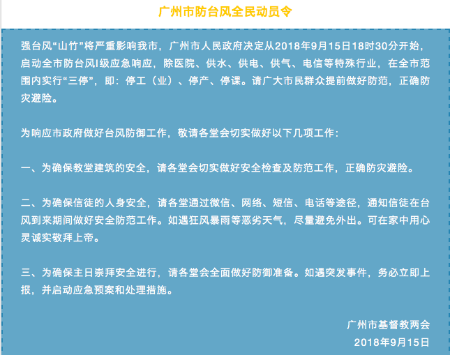 广州市基督教两会微信公众平台15日发文,提醒各堂会做好台风防御工作要“确保教堂建筑的安全”、“信徒的人身安全”、主日崇拜期间要“做好防御准备”。