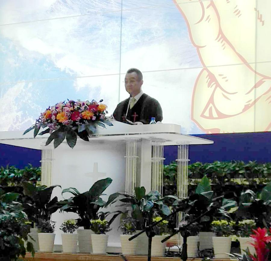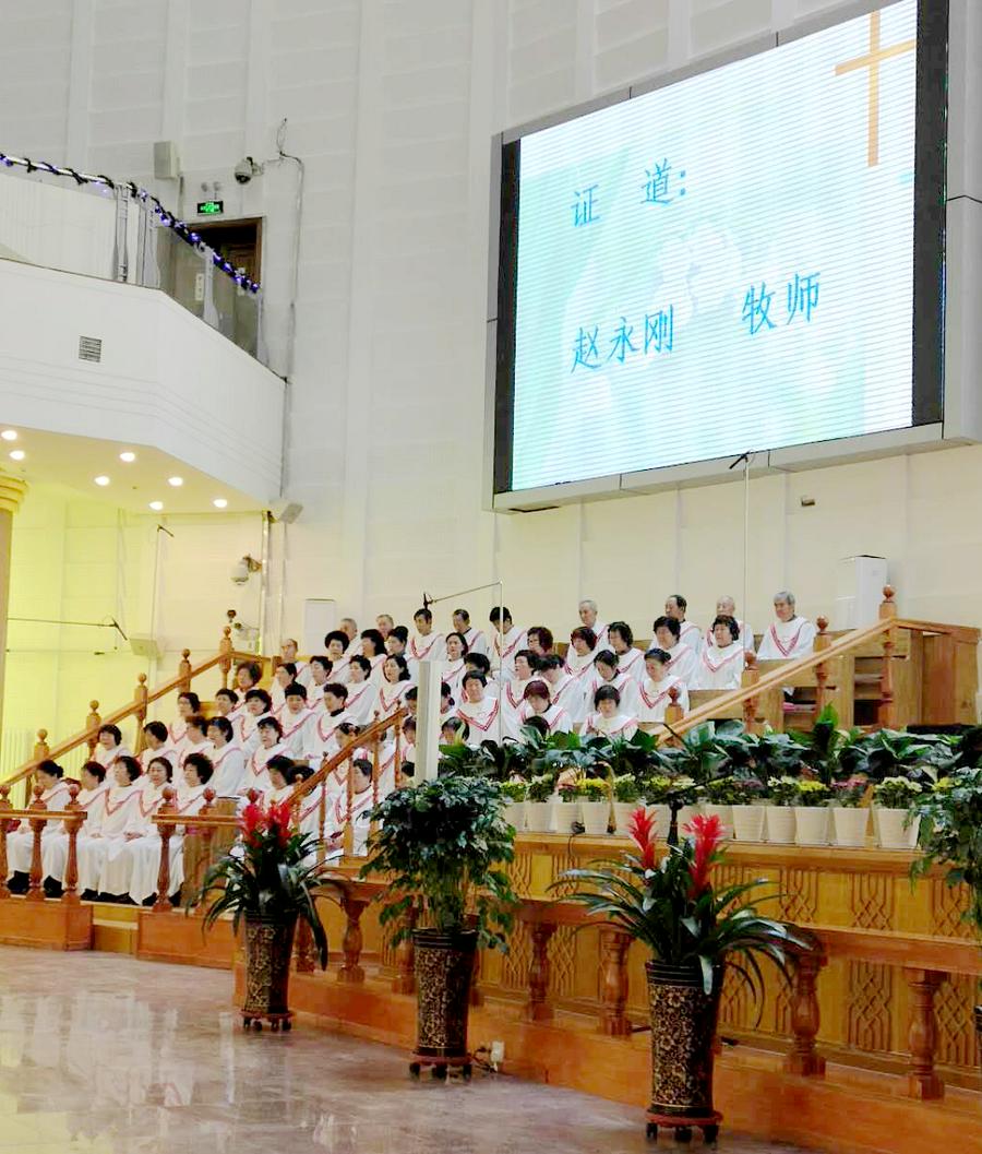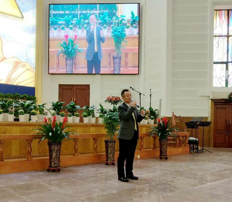 今天的大连冬雨淅淅沥沥,犹如春天一样的温暖。丰收路教堂圣台上摆放着150盆争芳斗艳的鲜花,大屏幕上“神爱世人”赫然显示。教堂充满圣灵感动、充满节日气氛、充满欢歌笑语、充满赞美敬拜。大连市基督教两会主席赵永刚主任牧师精神焕发的主持了圣诞节活动。赵主席首先和各位老年同工分享了圣经经文,并满怀感恩之情为主证道。