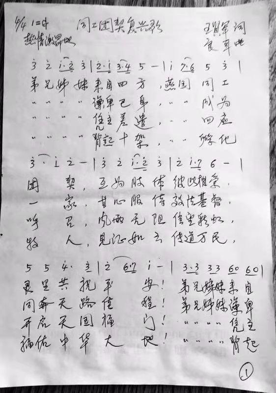 注:此诗歌是献给燕京神学院同工团契,由王贤军做词,燕京神学院唱诗班指挥良耳老师手写谱曲。