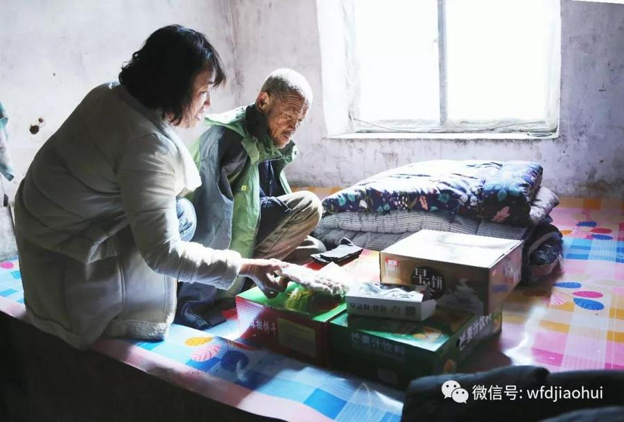 大家来到王长胜老人的家中,看到老人蜷缩在满是泥土的炕上,身下的被褥已经分不清是什么颜色。老人身着一件破旧的棉袄,敞着怀露出褐色的胸膛。炕上两个小钢盆,一个钢盆中盛着已经变硬的米饭。见此情景,不免令人感到酸楚。杨晓红帮助把老人扶下炕,就开始和大家一起打扫卫生。崔鹏牧师和同工们一起为老人家铺上了新的地板革,拿出新的被褥送给他;杨晓红帮助老人从内到外换上新衣服;大家将饼干香肠等食品送给老人。王长胜换上新衣服,精神看上去也好了很多,破败的小屋内,顿时有了过年的气氛。