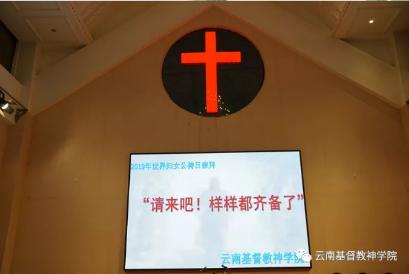2019年3月1日晚19:30,云南基督教神学院在彩云堂举行2019年世界妇女公祷日崇拜。此次公祷日主题为“请来吧,样样都齐备了”,经文来自路加福音14:15-24。崇拜由王付仙姊妹主礼,何慧玲老师证道,张睿姊妹、张贵云姊妹、恰三夺姊妹参与辅礼,崇拜活动有学院师生及弟兄姊妹170多人参加。