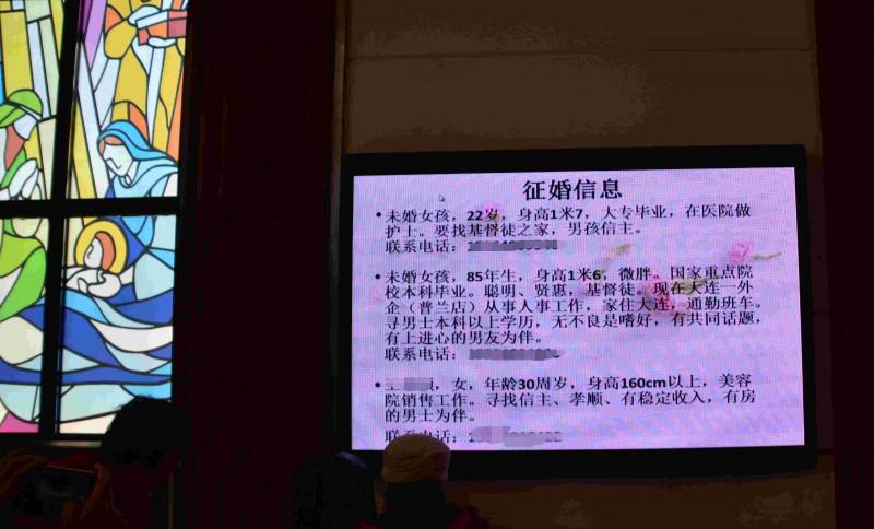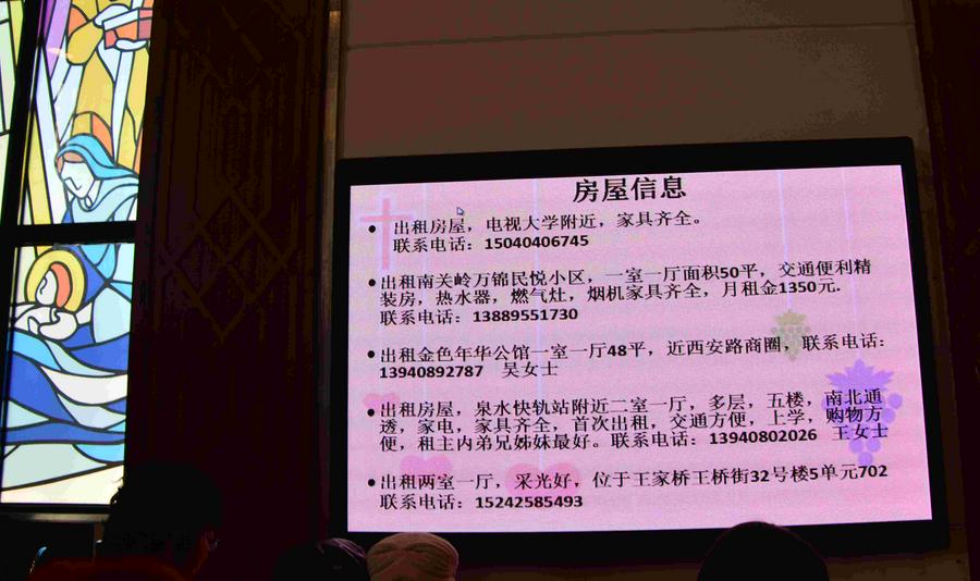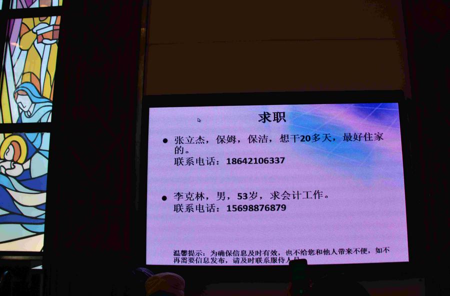 第二件事是教会的免费广告。说起来丰收堂的免费广告已经有较长的历史了。笔者记得原来初期是手写、打印的,好像是叫做“爱的桥梁”。现在教会投资下已升级为LED屏幕显示的了、字体大、明显,信息量也大了。丰收堂的免费广告面向广大信众,包括信徒的公司等,其内容包括征婚、招工、求职、房屋租赁和教会活动预告等,比较丰富,每天滚动播放,吸引了前来聚会的信徒驻足观看。有的用笔记、有的用手机拍照、有的在当场就打电话联络,还有的信息发布人在现场与同工交流。