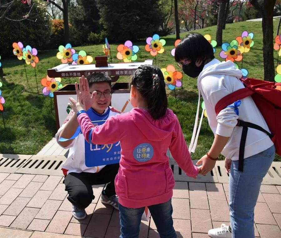 融合击掌环节,志愿者、游客与自闭症儿童及家长击掌,为他们系上了象征友好和接纳的蓝丝带。通过肢体和语言上的沟通,自闭症儿童与普通人之间,心与心的距离拉近了。