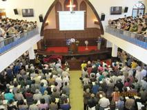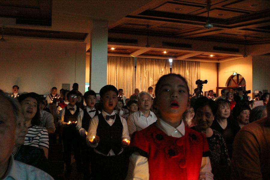 晚会以敬拜赞美拉开帷幕,一段视频首先带领大家回顾了百年堂风风雨雨的四十年,也是蒙主保守的四十年。在黑暗中,伴随《奇异恩典》的清丽童声,一个小朋友出现在台前,就在大家为之沉醉的时候,一群手拿蜡烛的小天使们出现在教堂各处,教会服事同工也手捧金灯台,越来越多的声音汇集进来,“奇异恩典,何等甘甜,我罪已得赦免……”场面令人震撼。
