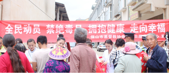 在2019年第32个“国际禁毒日”到来之际,保山市基督教协会磐石社会事工服务工作委员会,于隆阳区西邑乡永兴街举行以“全面动员、禁绝毒品、拥抱健康、走向幸福”为主题的宣传活动。