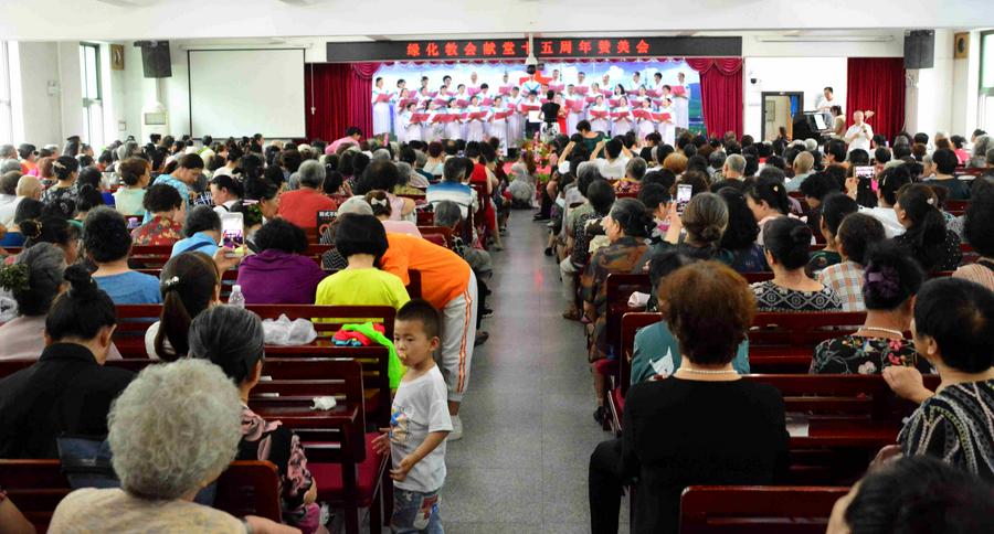 这是神所赐给的美好的日子,这是绿化街教会会众早已期盼的好日子,庆祝献堂十五周年庆典在喜乐、欢欣的气氛中拉开了帷幕。3400平方米的四层楼教堂和附属礼拜堂座无虚席,主楼的建筑上五星红旗高高飘扬,LED大屏幕显示器滚动播放具有基督教中国化、欢庆节日气氛的图片、诗文等,二楼的中心会场布置的神圣庄严。