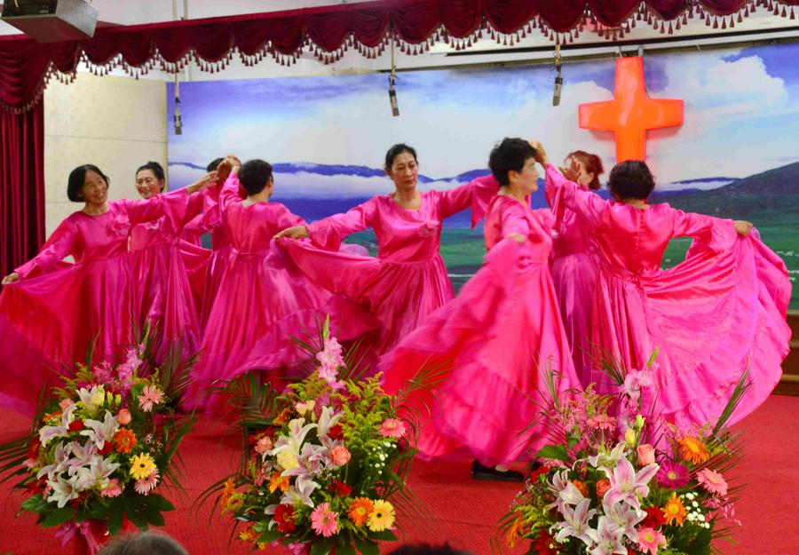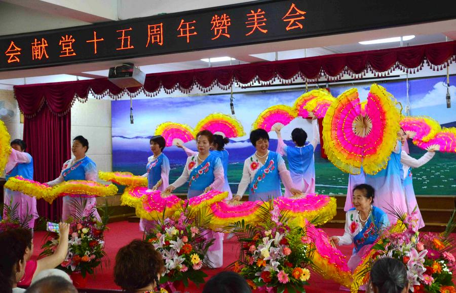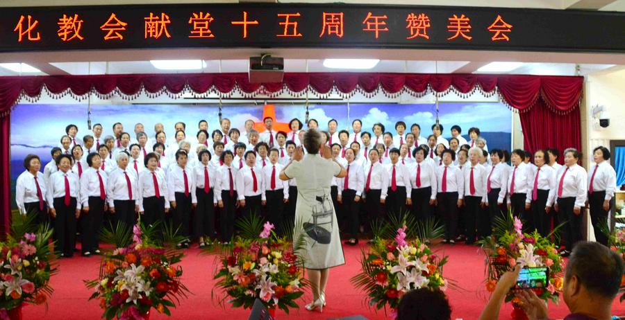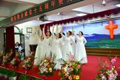 证道结束后,在袁明牧师带领会众高颂《我今天为你祝福》等赞美歌声中,鞍山绿化街教堂献堂15周年的庆典演出开始。教会的诗班等各个团契和聚会点,把精心预备的大合唱、独唱、舞蹈、器乐合奏、诗朗诵等22台精彩节目为主献上。