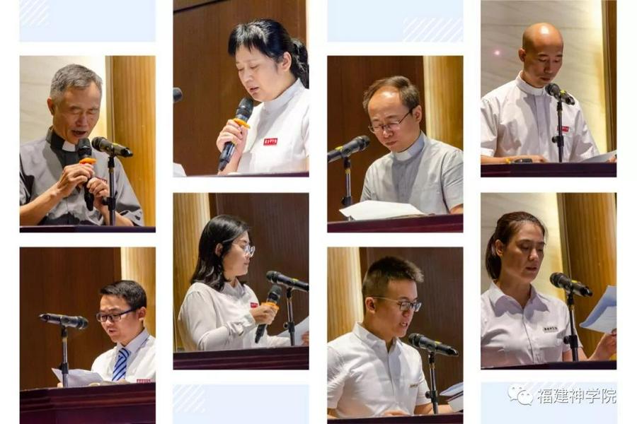 一首《为国求福歌》之后,元思佳老师、汪勃呈同学、陈秀芳同学分别宣读经文,福建神学院学工处陆晗牧师祷告。随后,高超牧师、孙旭图牧师、曾德胜老师带领会众一同启应祷文,福建神学院副院长黄朝章牧师为国家、为社会、为世界和平献上专项祈祷。大家与黄朝章牧师同心仰望,祈求主能够眷佑中华大地,使祖国繁荣富强、民族兴盛、国泰民安;在生活中,盼望我们一班属神的子民能行事常存清洁的良心,对人常存无伪的爱心;并且希望“和平之君”——上帝赐下和平,使国与国、民与民之间和睦相处、彼此相爱,这是神的儿女共同的期望。