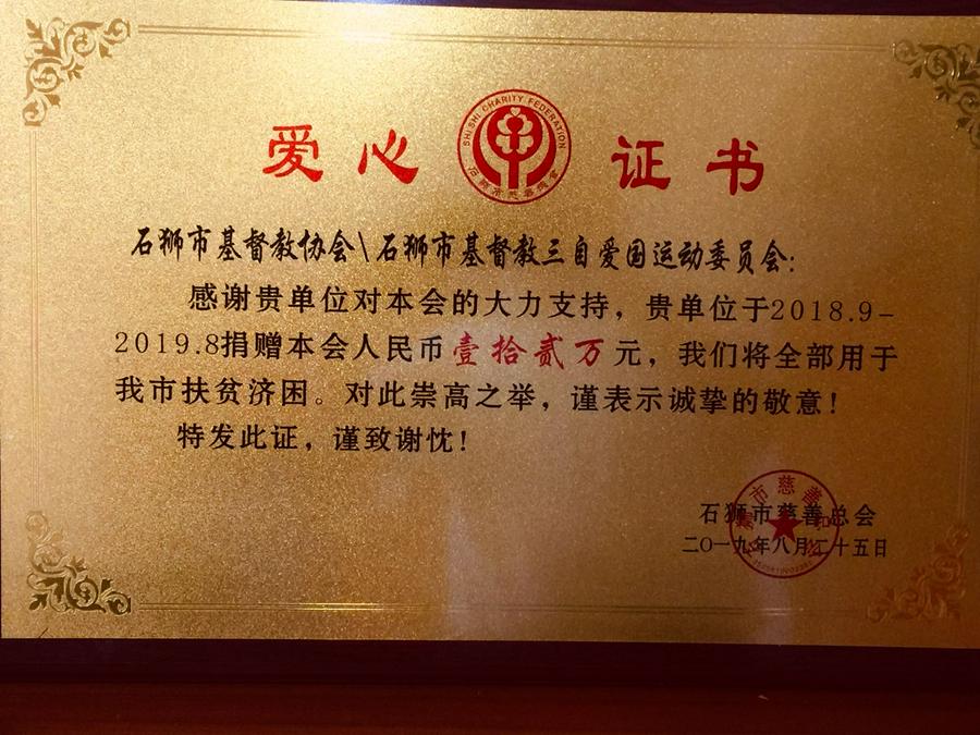 2019年8月25日, 石狮市基督教“两会”还捐款6万元给石狮市慈善总会,作为扶贫济困之善款。