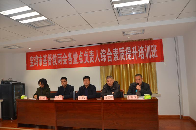 上午9:00,在雄壮的《国歌》乐曲声中,宝鸡市基督教两会各堂点负责人综合素质提升培训班开班仪式拉开了序幕。主持人市基督教三自爱国会主席张万宝教师首先依次介绍了台上就座的应邀嘉宾:陕西省基督教两会副主席、副会长王清文牧师、宝鸡市民宗局调研员方跃辉、市民宗局宗教科梁小兵科长。接着介绍了前排就座的宝鸡市基督教两会班子成员:市基督教协会会长王琼牧师;市基督教两会常务副主席、常务副会长易莲梅长老;市基督教两会副主席、副会长张金会长老;市基督教两会秘书长兼总干事胡国胜同工;还特别邀请了名誉主席王炳慧牧师、名誉会长范克孝长老参加开班典礼。