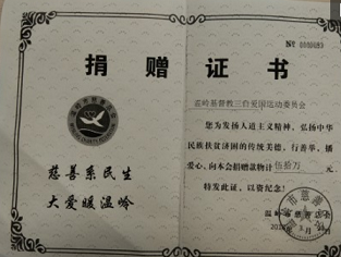温岭市慈善总会授予温岭市基督教会(三自爱国会)颁发捐赠证书,以资纪念!