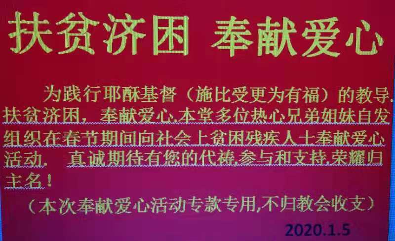 2020年元月20日上午,福建省漳洲市东山县基督教文峰堂,铜陵镇残联,城南社区居委会联手在基督教文峰堂开展“让爱走动,共享美好”向贫困残疾人士新春献爱心活动。