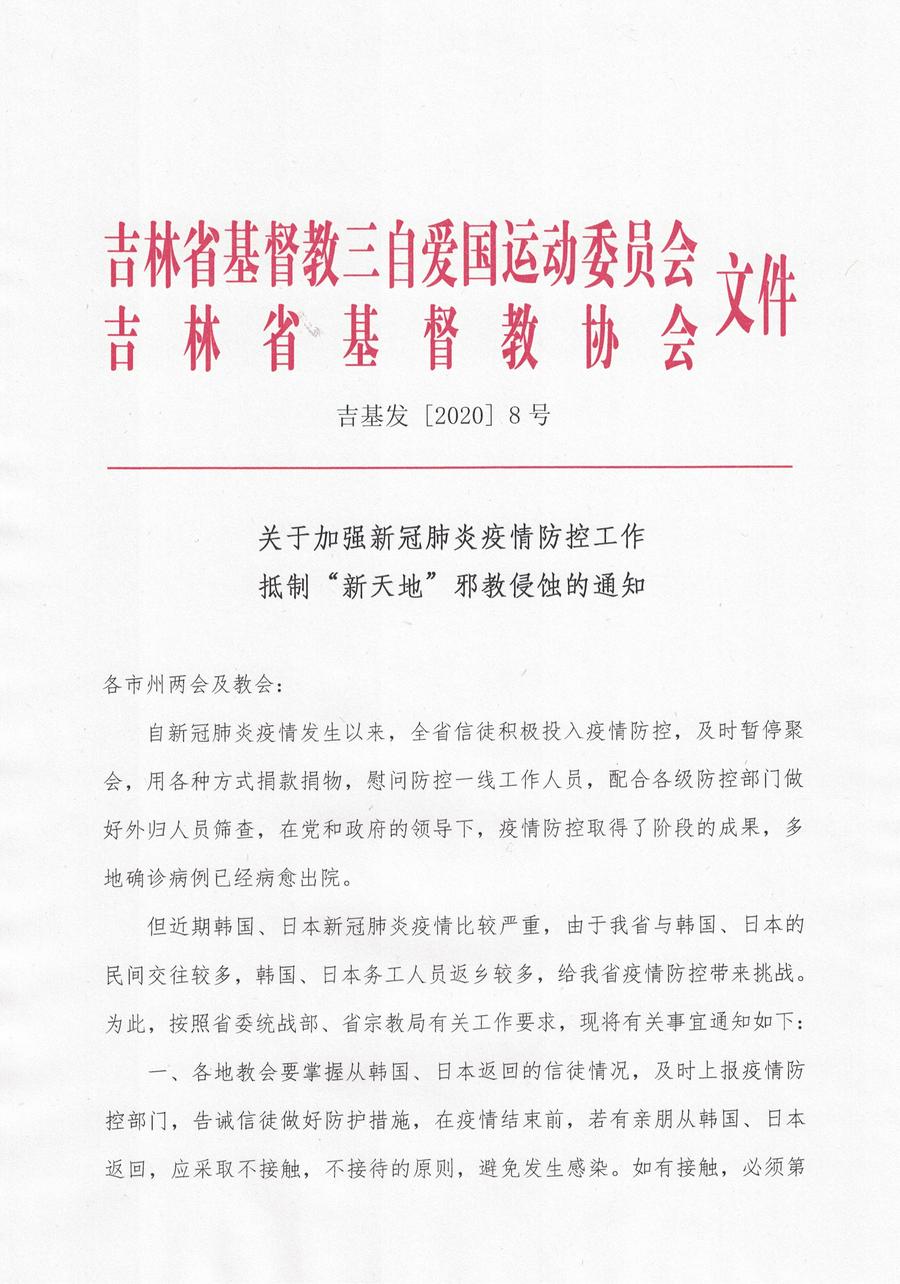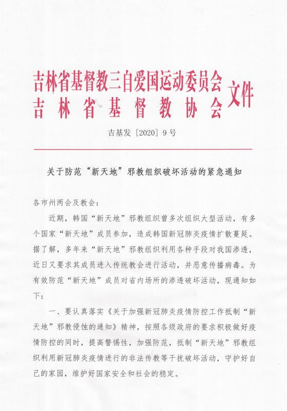 由于在防疫期间活动场所暂停聚会,一些异端邪教组织蠢蠢欲动,利用各种手段拉拢信徒,并妖言惑众,破坏教会和社会次序,带来极大的危害。据了解,近期韩国疫情爆发,与“新天地”邪教有关,由于“新天地”邪教在吉林省也有活动,为防止“新天地”邪教利用疫情对省内教会的渗透与破坏,吉林省基督教两会2月24日下发《关于加强新冠肺炎疫情防控工作,抵制“新天地”邪教侵蚀的通知》,通知要求: