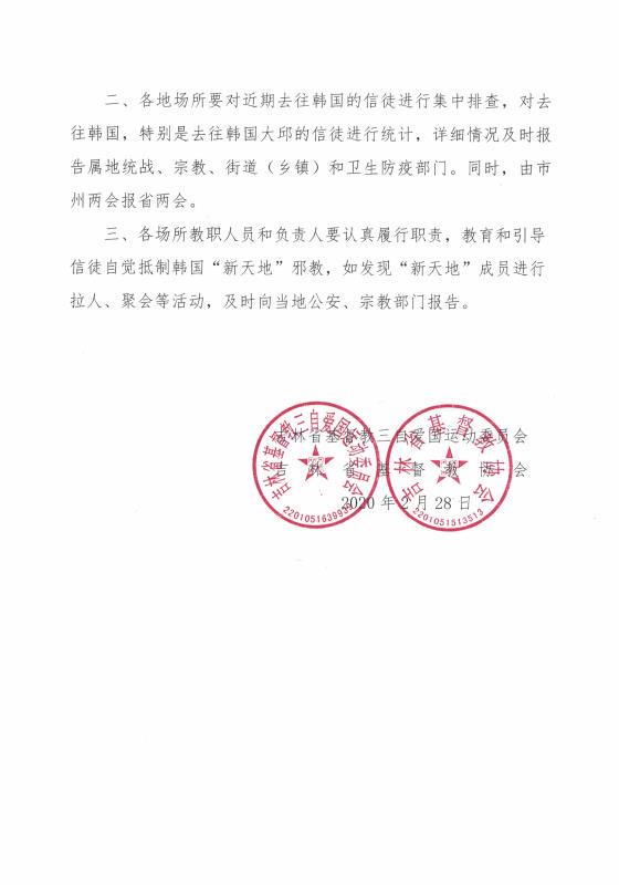 通知发出后,得到省内教会的积极反馈,在继续疫情防控的同时,积极开展防范韩国“新天地”邪教的渗透破坏,为了更好的指导基层教会做好防范,吉林省基督教两会于2月28日发出《关于防范“新天地”邪教组织破坏活动的紧急通知》,要求市州两会和教会,在积极做好疫情防控的同时,提高警惕,加强防范,抵制“新天地”邪教组织利用疫情进行的非法传教等干扰破坏活动,守护好自己的家园,维护好国家安全和社会的稳定。同时,要求各地教会对近期去往韩国的信徒进行排查,特别是去往韩国大邱的信徒进行统计,并把详细情况报告属地相关部门和省两会。最后,要求教职人员和教会负责人认真履行职责,教育和引导信徒自觉抵制韩国“新天地”邪教,如发现“新天地”成员进行拉人、聚会等活动,及时向当地公安、宗教部门报告。