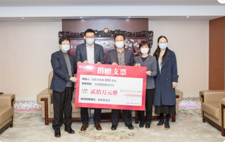 3月16日下午,江苏省委统战部常务副部长李国华、副部长马连美等领导会见了加拿大华商郭阳。会见中,郭阳向爱德基金会捐赠20万元人民币,定向用于慰问在此次战疫中献出宝贵生命的8名抗疫英雄的家属。爱德基金会理事长丘仲辉代表爱德接受捐赠。