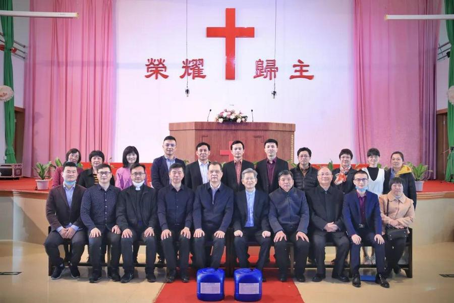 座谈会后,由林泽伟牧师祝祷,蔡自力主席代表泉州市基督教两会向泉港区基督教两会赠送了由石狮爱星环保科技有限公司陈主星、陈恩胜父子捐赠的消毒液,助力泉港区教会的疫情防控工作。