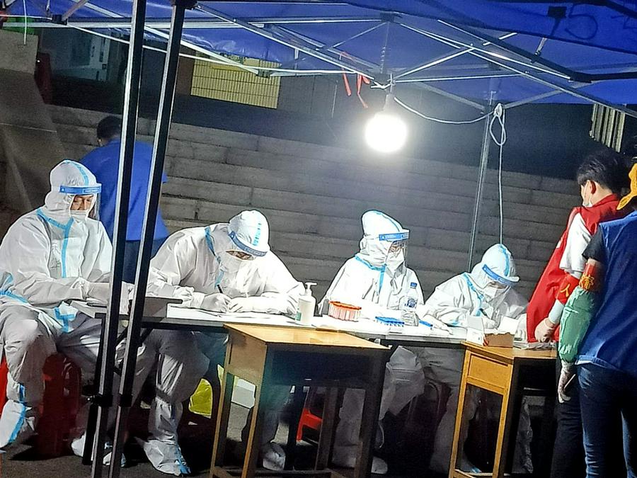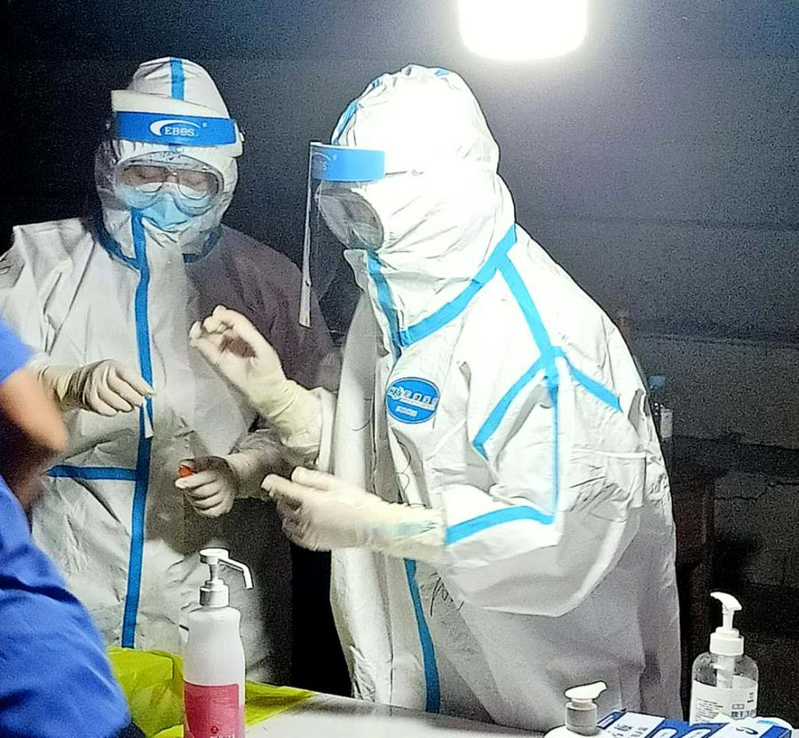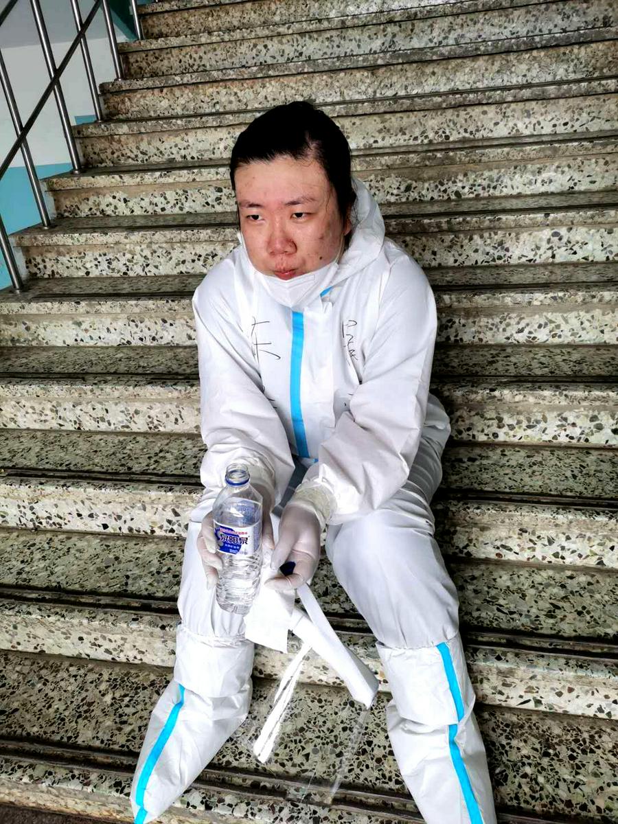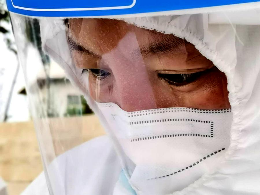 说到苦和累,确实苦、确实累。穿着不透风的防护服、烈日当空,站立组织群众接受检测,要劝说有秩序、要喊话,遇到不理解、不守规矩的群众,不能生气、不能着急。当我们因为没及时喝水嗓子哑了、当我们在树下眯一会儿,稍事休息,受了风寒难受的时候,我们也后怕,担心是不是被感染了。但是,只要症状消失,我们又重新恢复了斗志,继续精神抖擞的工作。现在,我和同伴们已经在这里八天了。