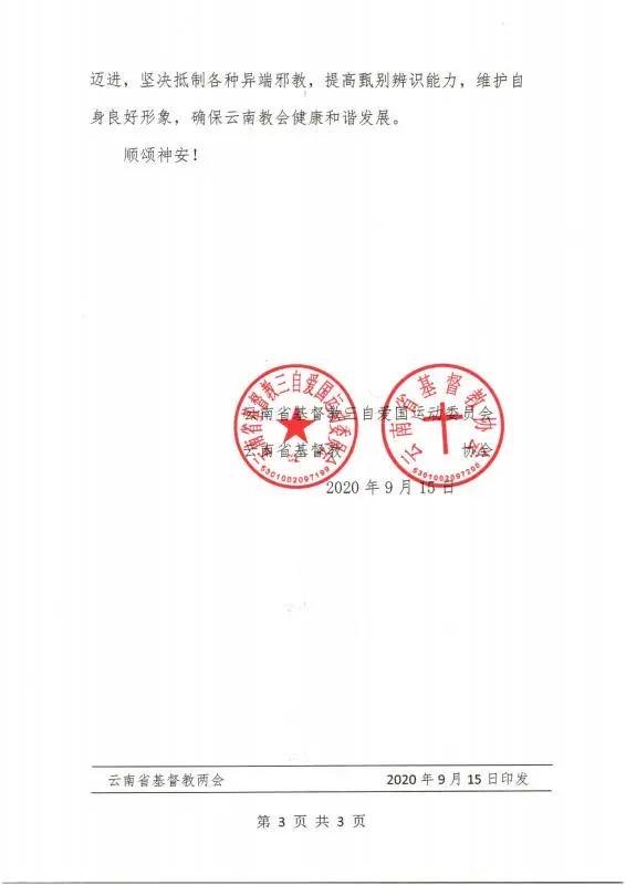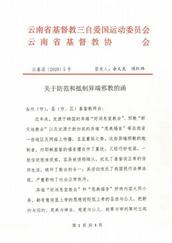 为了能更好地引导云南教会信徒持守正道,纯正讲台宣讲信息,省基督教两会特发此函,要求各级基督教两会转发给所属各地教堂(固定活动处所、临时活动地点),并在主日崇拜中向弟兄姊妹宣读。督促他们做好异端邪教的防范和抵制工作,对涉及非法传教及扰乱社会秩序问题,及时向有关部门反映情况;对已经深受迷感的教职人员和信徒,要用主的爱耐心去教导、挽回;对几经劝勉仍不回头的少数顽固不化的教职人员、信徒和恶意传播者,一经查实,视其情节,可按《中国基督教教会规章》《云南省基督教教职人员认定实施办法》给予相应惩戒。