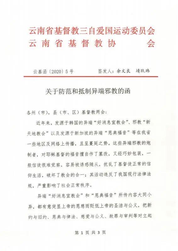 近日,云南省基督教两会发函,提醒各教会防范和抵制异端邪教,谈及“恩典福音”和“新天地教会”。
