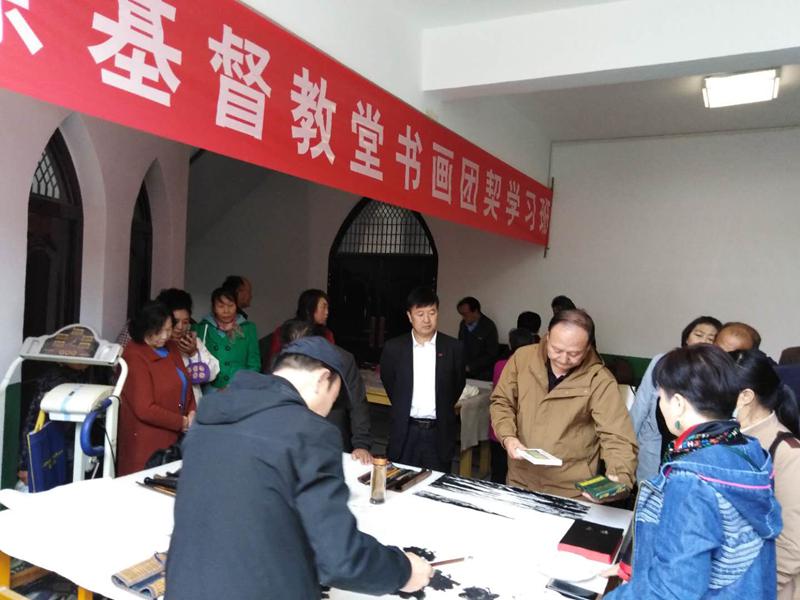 吃过午饭后,在下午14:00,在李牧师主持下,举行了“三自爱国运动发起七十周年书画交流会”。活动分为两部分,首先是在教会一楼主堂,举行了启动仪式,为前来参加书画交流会的十四位书法家、画家每人赠送了一本16k本的圣经。李牧师依次与每位书法家、画家,手捧圣经单个拍照及接着与大家合影留念。其次,在教堂二楼书画室举行了现场挥毫画画、执笔书法演示交流。参加书画交流会的十二位书法家、画家,在书画培训班王宗明老师和原平凉市美协主席胡晓云带领下,分别在五个案桌前挥毫泼墨,画出一幅幅精美图画和书写了一幅福圣经话语的墨宝。