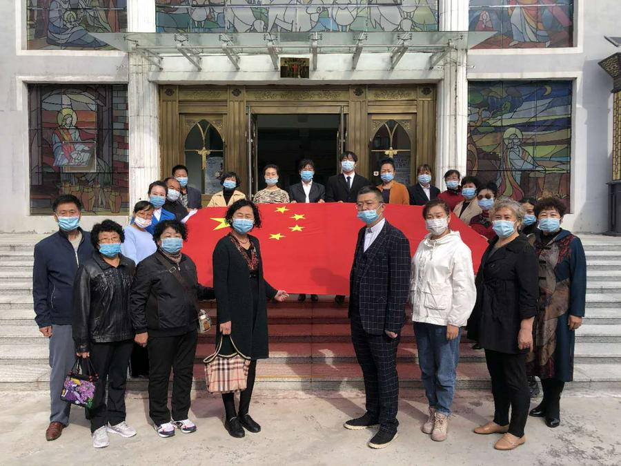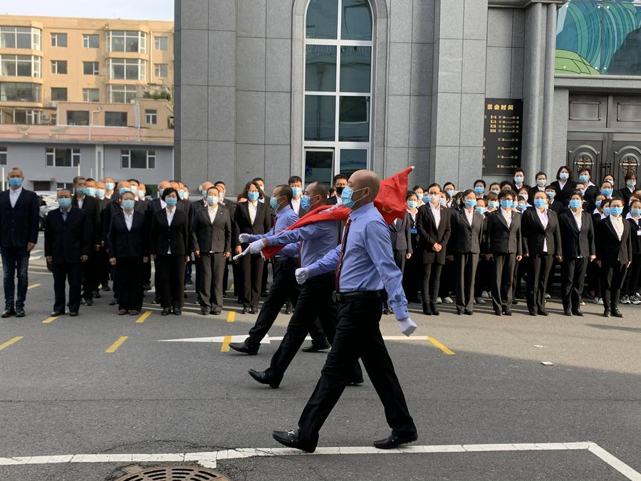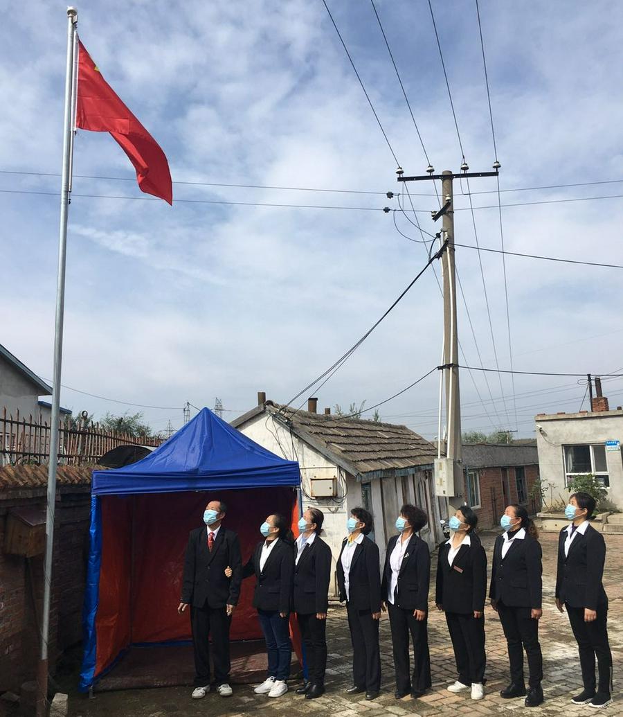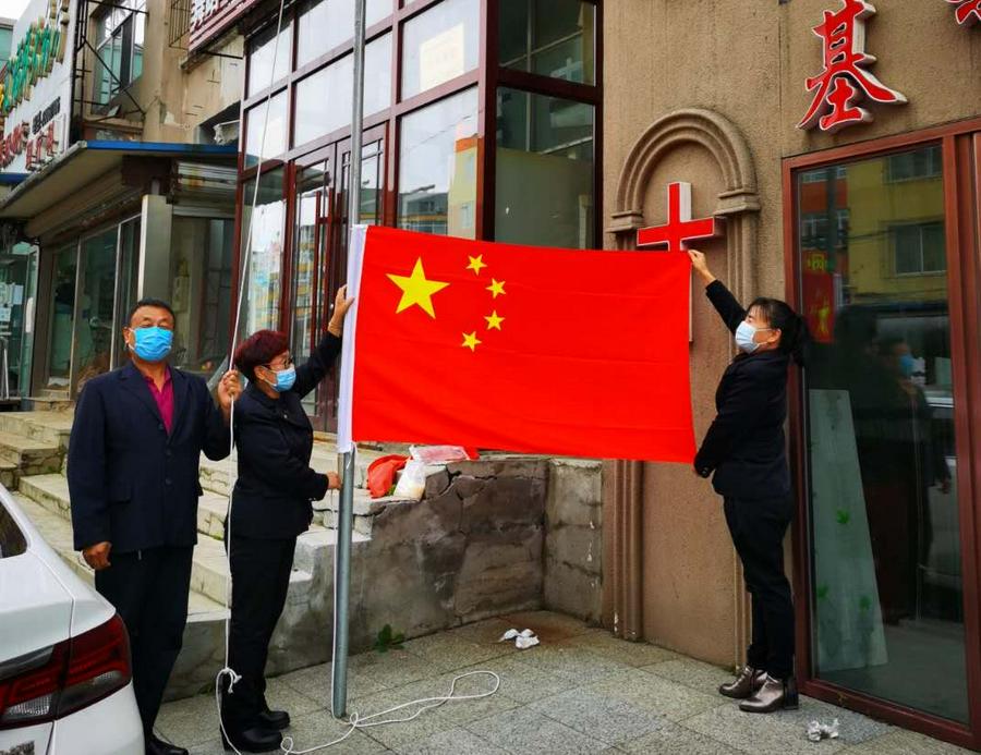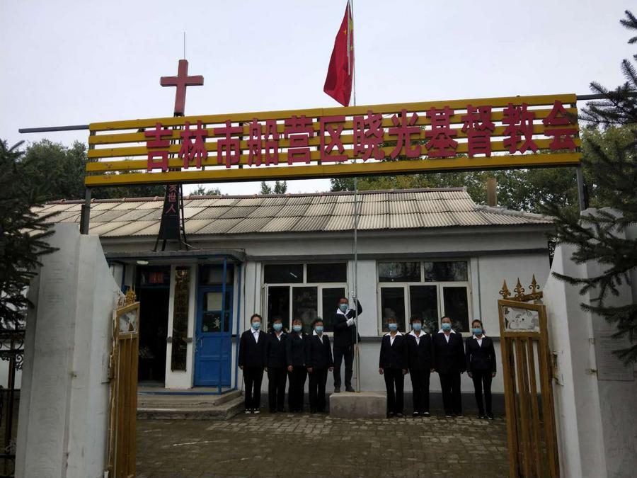 2020年10月1日,吉林市船营区北京路基督教感恩堂举行升旗仪式,伴随着雄壮嘹亮的国歌声,全体同工在吉林省基督教两会主席兼会长任大中牧师的带领下,向冉冉升起的五星红旗行注目礼,为祖国来之不易的防疫胜利感恩,为场所恢复敬拜活动而感恩;共同祝愿祖国更加繁荣昌盛!人民更加幸福安康!家乡更加和谐美丽!中国教会越来越荣神益人!