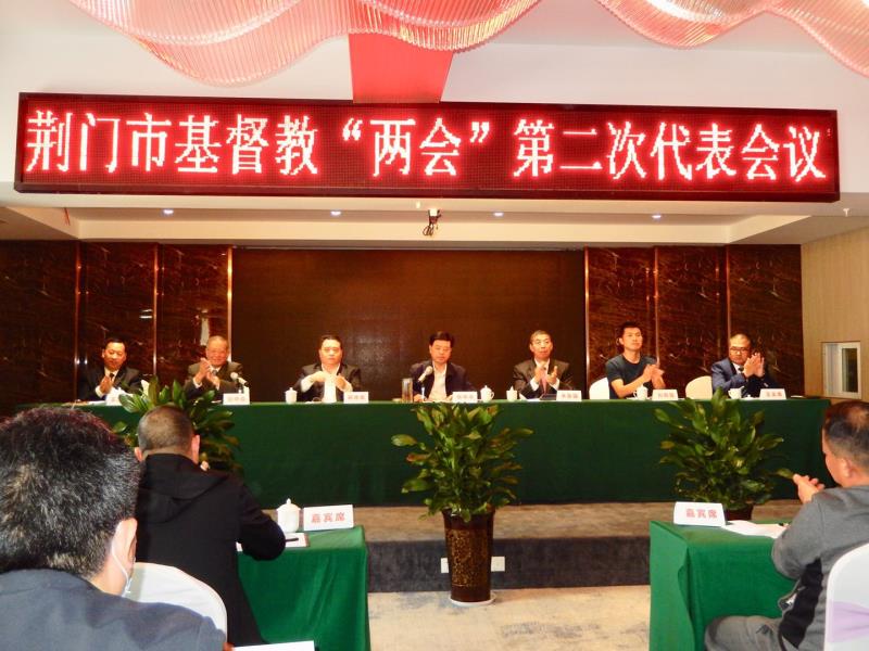 湖北省基督教三自爱国运动委员会主席朱致国牧师、荆门市市委常委、市委统战部部长郑中华到会祝贺,对新当选的荆门市基督教两会班子提出了要始终高举爱国爱教旗帜,自觉服从和服务于党和国家工作大局,在凝聚基督教合力上下功夫,在发挥桥梁纽带作用上下功夫,不断开创荆门基督教事业健康发展新局面的希望和要求。