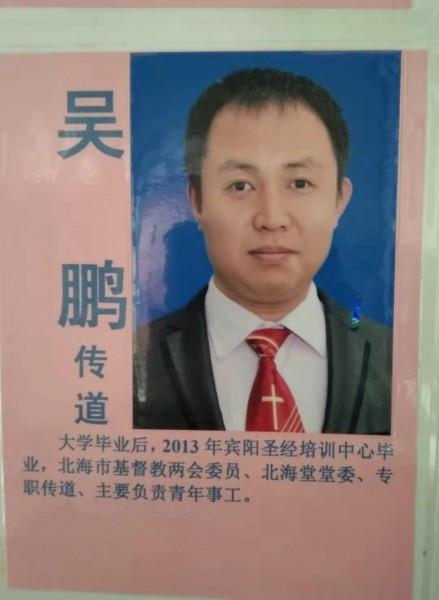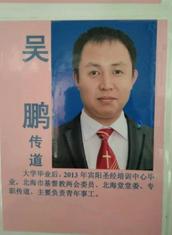 吴鹏,1987年生人,蒙古族。大学即将毕业的时候因视神经萎缩而双目失明,蒙主拣选后读神学二年,现在广西北海基督教会任专职传道人。每月讲道十次以上,他每天大约只睡五个小时的觉,用圣经真理和爱心帮助过有心理疾病、信仰迷茫、遇到婚姻、家庭、职场等问题的3,000余人;在广西基督教两会组织的基督教神学交流比赛中仅以0.5分之差荣获二等奖……