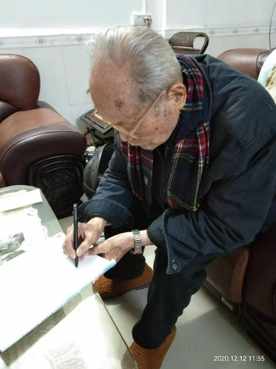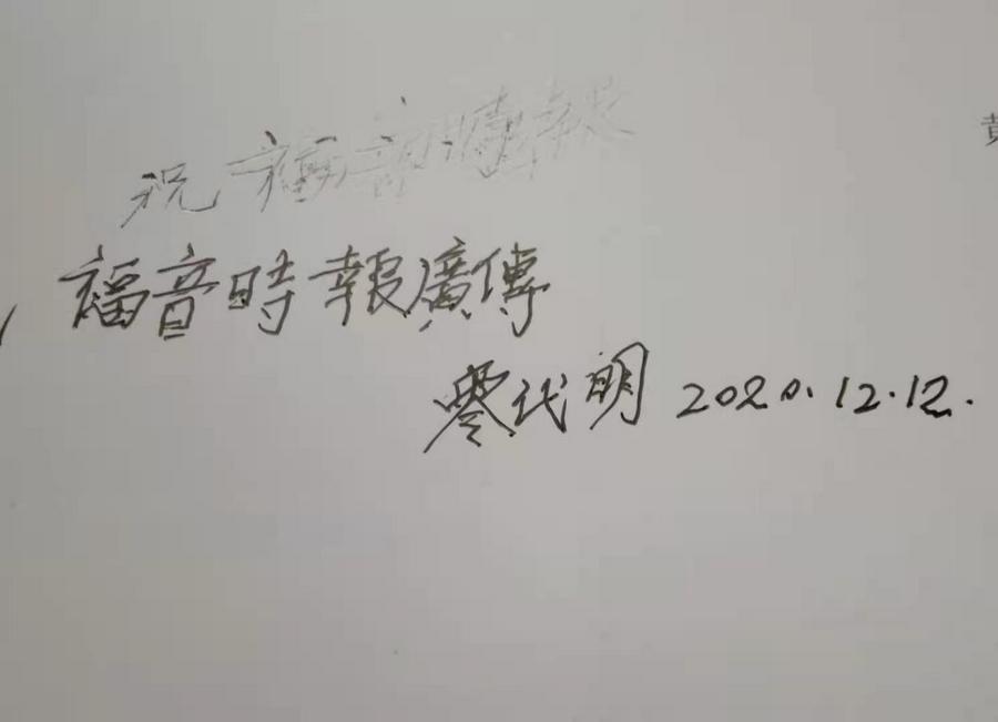 一个多小时的访谈即将结束,我请老牧师为福音时报写几句后。他用繁体字写到:“福音時報廣傳,零代明,2020.12.12”。