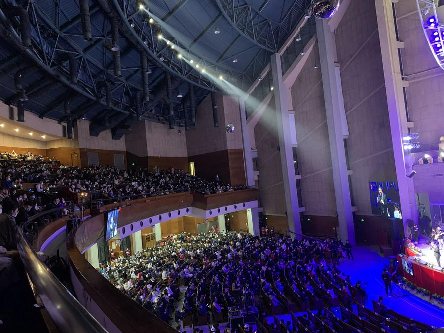 2020年12月24日是平安夜,杭州基督教崇一堂举办“主赐平安”圣诞赞美会。此次赞美会需要提前预约选座,由于疫情防控需要,崇一堂此次平安夜活动共开放了1028个可预约座位,而该堂往日可容纳5000人同时敬拜。没有提前预约的,也可排队领号入内,不过只能进入小礼堂,通过大屏幕观看整场活动。