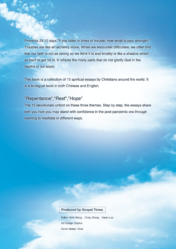 本刊收集了围绕此主题来自中外基督徒和牧者的灵修共15篇,并透过翻译进行了中英文的双语排版。