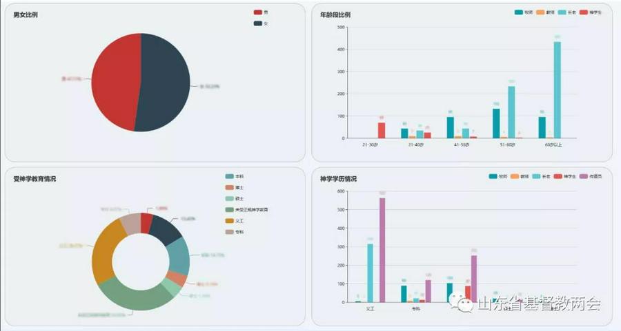 该数据库初步实现以柱状图、饼图、折线图等方式直观地展现出全省教牧人员的情况,透过数据分析,可以显示出基层教会面临的问题和需求,结合调研问卷中集中反映的困难和建议,为省基督教两会领导班子准确掌握全省教会情况,帮助解决基层热点难点问题、筹备各项教务及帮扶事工提供有效依据。特别对于整合优化资源,系统性、科学性、针对性地开展神学教育培训工作,进一步提升全省教牧人员综合素质和服务能力,促进教会规范化建设具有重要参考价值。该数据库会随着研究中心对相关信息的进一步调研不断更新和丰富,为省基督教两会准确把握基层教会需要提供各项服务,维护山东教会健康稳定发展提供针对性和前瞻性意见。