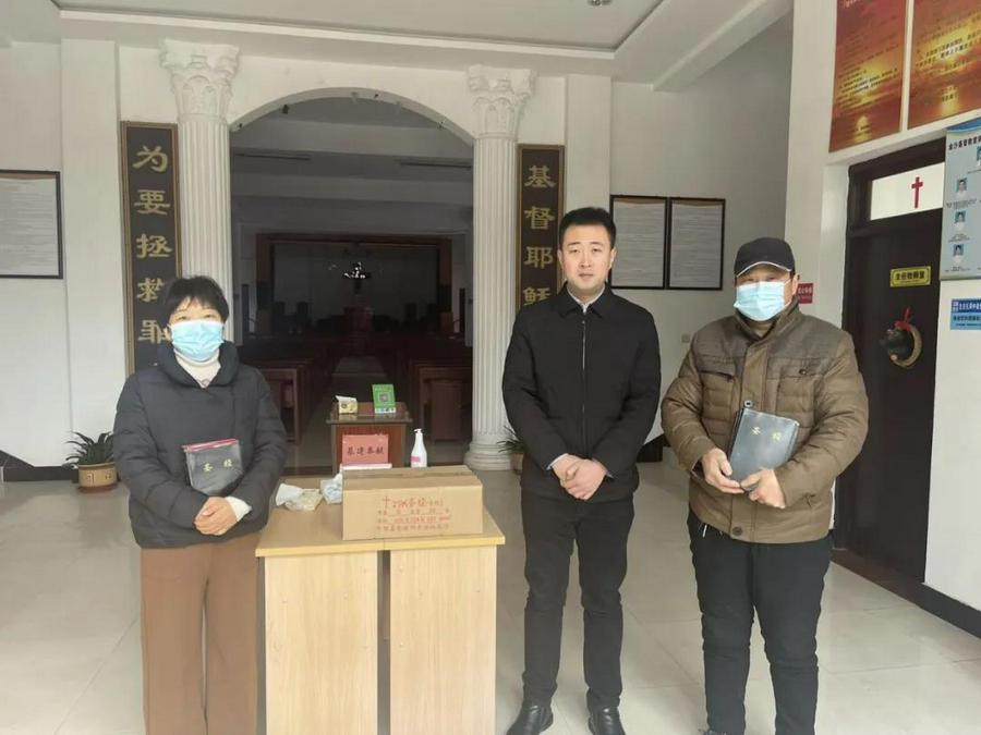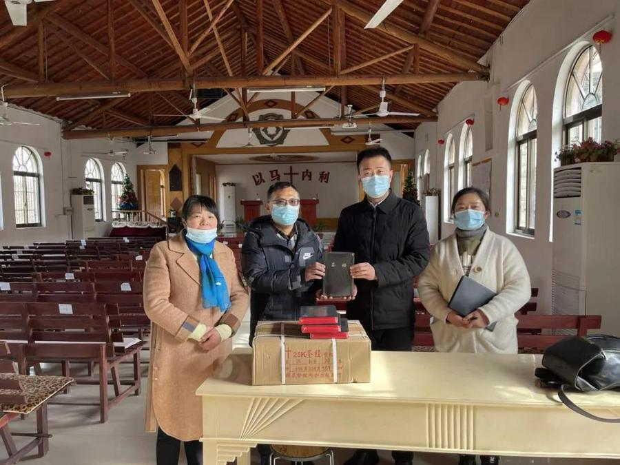 南通市通州区基督教三自爱国运动委员会主席邱成牧师将江苏省金会赠送的圣经分别赠给各教会,让各教会合理分配给有需要的弟兄姊妹。