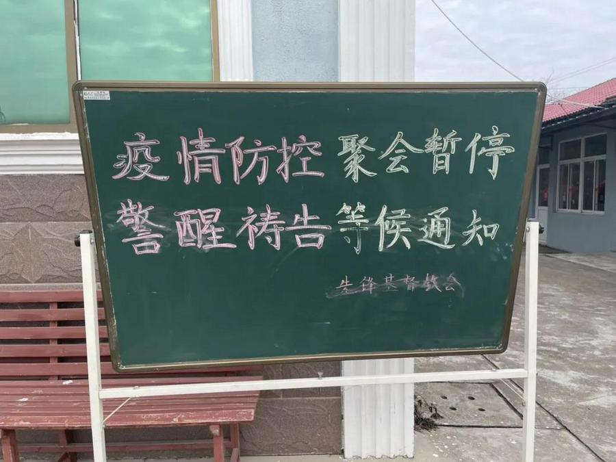教会同工已经在教会微信群里通知,实在没有收到消息的信徒来到教堂,同工们在黑板上写上“疫情防控,聚会暂停,警醒祷告,等候通知”等字样,耐心解释劝勉祷告,信徒们也表示理解,纷纷回去,看线上的牧师证道。