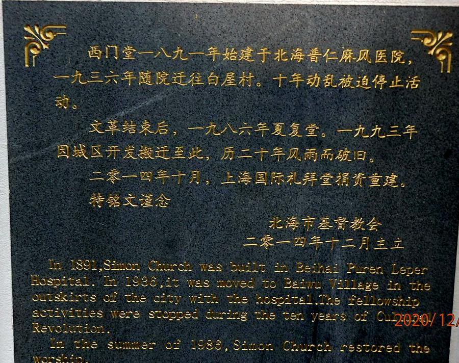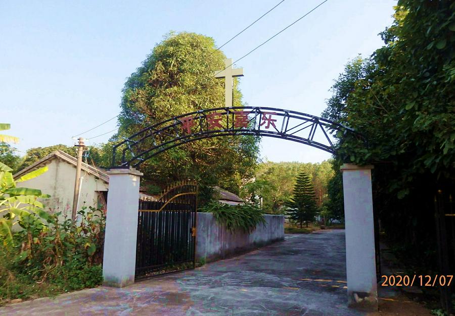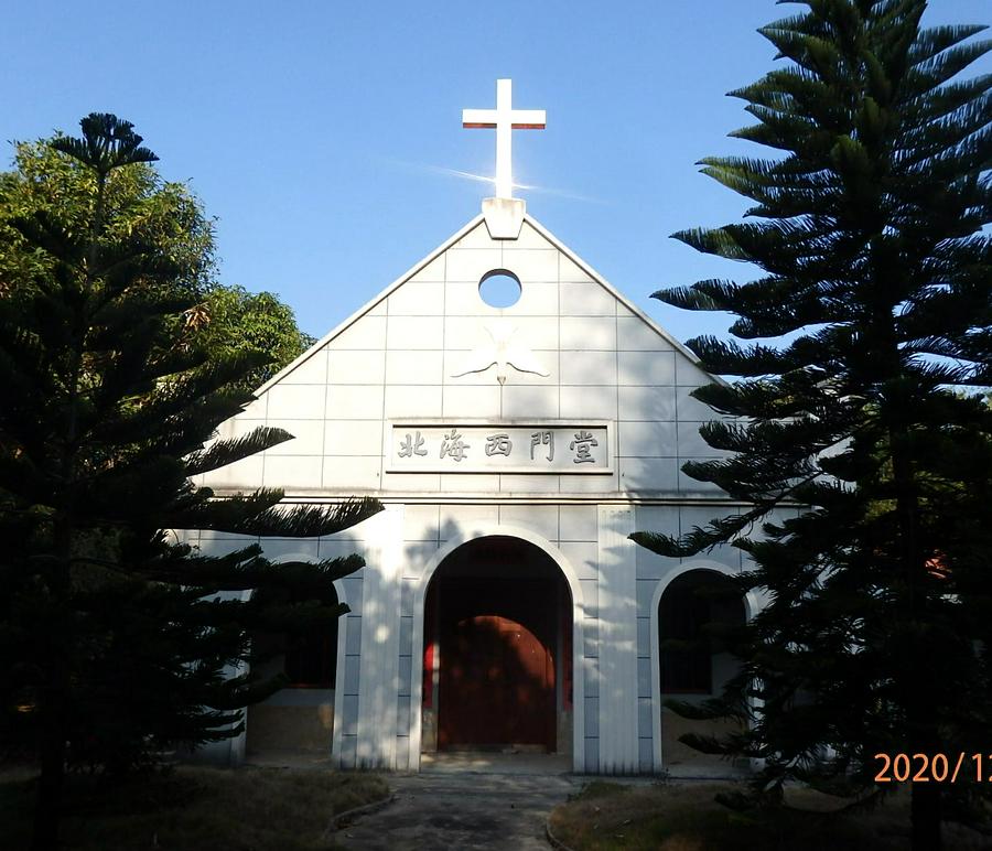 这里我们不能不提及1890年由柯达创立的附属北海普仁麻风医院,也就是现在的北海市皮肤病防治院。这家医院的建立,收治了当时被视为不治之症和“洪水猛兽”的麻风病人。百余年来,基督的爱没有因为时代变迁而失去,而是在继续发扬光大。在如今的合浦县蛟龙塘康复村(当地人称之为“麻风村”)就有约七十余位康复的麻风病人继续在这里生活,这里属于基督教北海西门堂(见图)。2020年12月7日,笔者和北海市基督教协会会长、北海堂张业忠主任牧师及同工曾经到这里探访。电视台曾经为这个康复村拍过一部电视片:《没有河流的村庄》。这里也是国内外基督徒和慈善人士关注、关心、帮助的地方。2019年7月,金陵协和神学院复校首届毕业生的各位中国基督教牧长也来此探访。