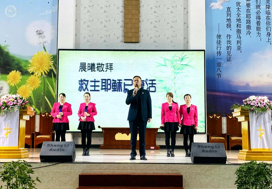 2021年4月4日春意盎然的清晨,6点到7点钟吉林省辽源市东丰堂举办了“双暂停”之后的第一场晨曦崇拜。此次敬拜会主旋律是《救主耶稣已复活》,由陈红烨同工带领众弟兄姊妹一同敬拜复活之主。