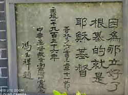 旁边的是石碑上镌刻着冯玉祥将军于1936年题写的:哥林多前书3:11的经文“因为那立好了根基的就是耶稣基督”。遒劲古朴的隶书字体,使人感受到中华传统文化的博大精深,虽历经岁月斑斑驳驳,但魅力无穷十分耐看。