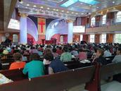 对那些行动不便的,会搀扶着送到二楼主堂。这时候的主堂里,一位姊妹已在为早到的姊妹弟兄教唱赞美诗歌......