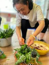 终于到了最重要、也是最开心的时刻,大家齐动手包粽子。在手艺娴熟的姊妹们的指导和协助下,大家你一堆,他一圈。迫不及待的捋粽叶、做漏斗状,再填进糯米、使劲压实压紧食材。然后巧手翻飞,封口、扎捆、成型。