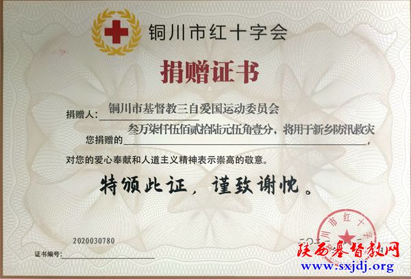 8月1日,在铜川市委统战部的联络下,市基督教三自爱国会将奉献款全部交于市红十字会,用于河南新乡的防汛救灾工作。铜川市基督教会弟兄姐妹的爱心行动,彰显了基督的博爱精神。