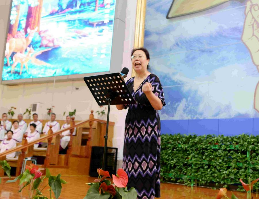 在诗班的圣乐赞美诗中,崔明霞牧师走上圣台,以《赞美、赞美》为讲章题目,为主证道。她告诉信徒,我们有两把钥匙:就是祷告和赞美。赞美会推动教会的复兴。让赞美充满我们的家庭当中、充满我们的教会当中。