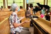 虽然不是主日崇拜的日子,但是今天前来参加聚会的信徒仍然热情高涨,主堂一楼按照间距基本坐满了弟兄姊妹。一位八十三岁和一位八十四岁的姊妹告诉我:教堂恢复聚会了,心里特别高兴,教会的礼拜六赞美会已经五年了,她从开始就参加,和牧师一起唱歌赞美。今天是这次疫情恢复聚会后的第一场聚会,她约了几个姊妹一起来的。